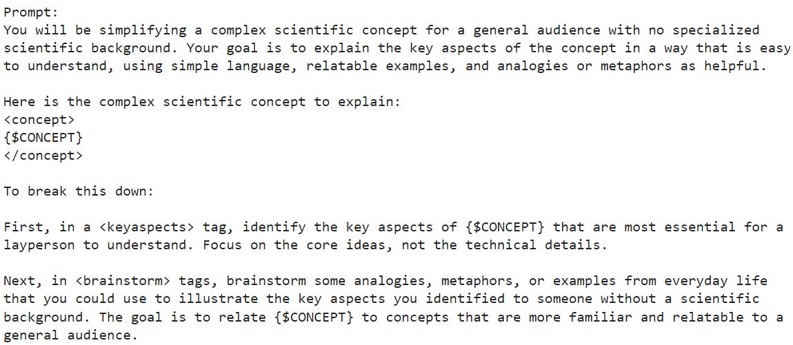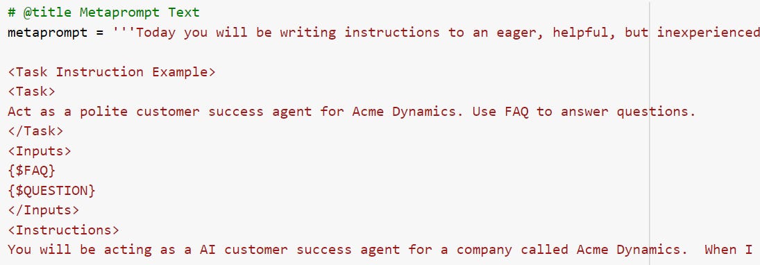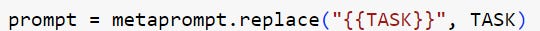 The above code creates the prompt for Claude by replacing the placeholders in the metaprompt with the actual task and variables.