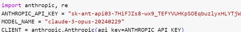 An API key is defined for authenticating with the Anthropic API and the model ‘claude-3-opus-20240229’ is selected for use.