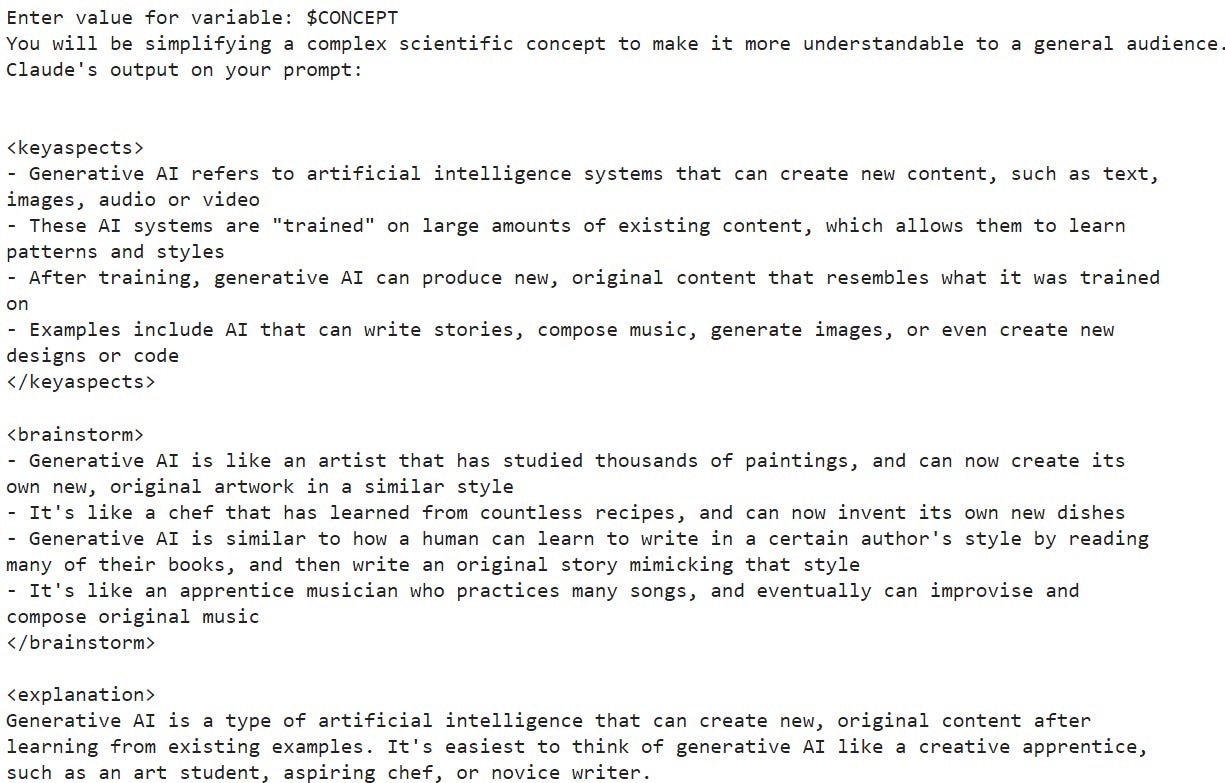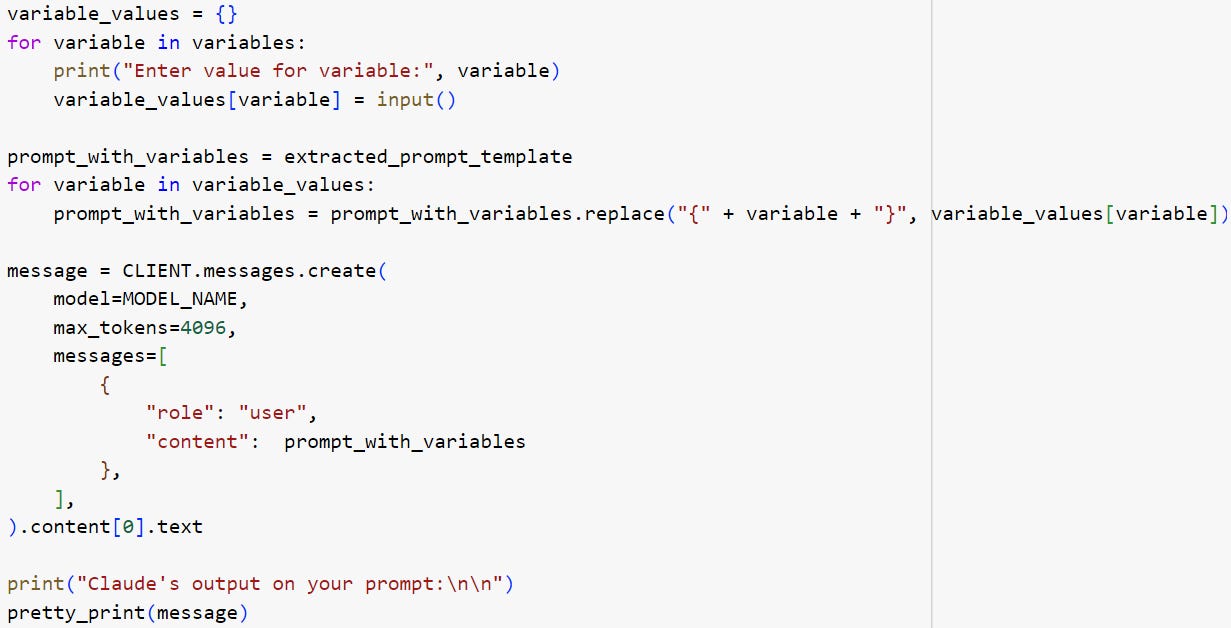 In the above code, the chosen task is in quotations, which users may change according to their own preferences. VARIABLES = [ ] specifies which variables Claude will need to complete the task. It’s empty by default, which means no specific variables are required unless specified.