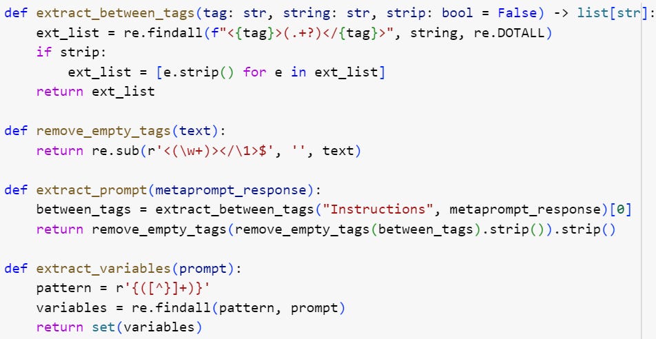 The above are the definitions for functions in extracting content between XML-like tags, removing empty tags, and extracting prompt from the <Instructions> section of the ‘metaprompt-response’ string using the extract_between_tags and the remove_empty_tags functions.