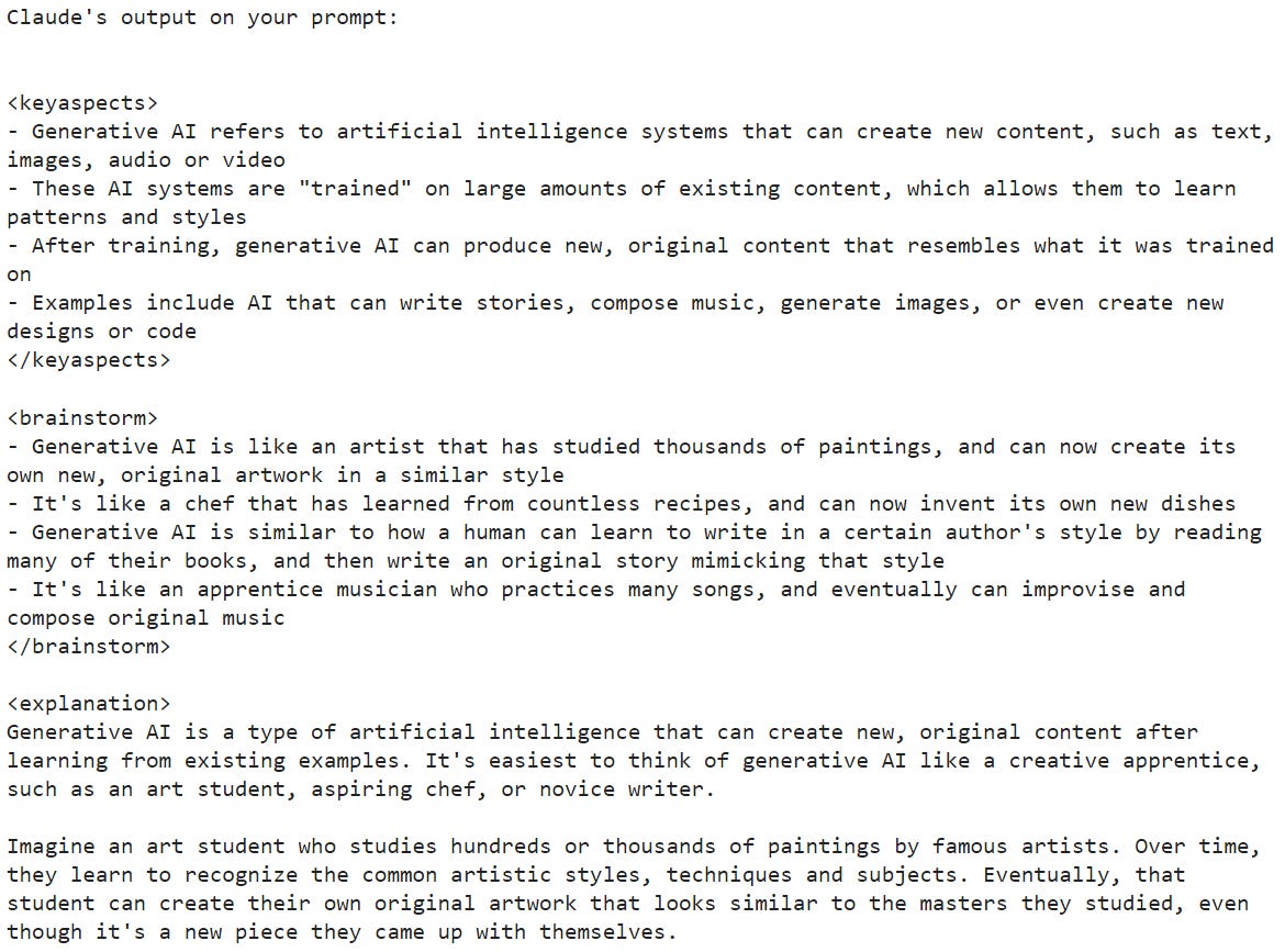 print(“Claude’s output on your prompt:\n\n”) and pretty_print(message) would show the following result: