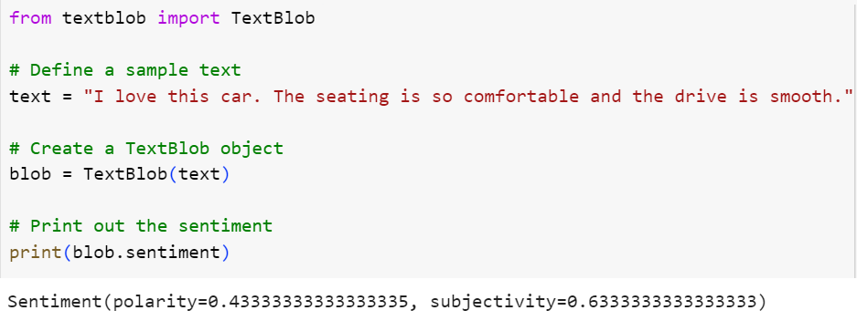 This code returns a polarity and subjectivity score. The polarity score ranges from -1 (negative sentiment) to 1 (positive sentiment), and the subjectivity score ranges from 0 (objective) to 1 (subjective).