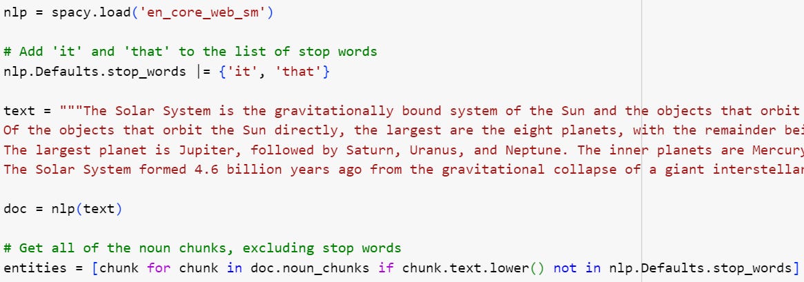 Below is code chunk used for extracting noun chunks from our text chunk above, treating them as primary entities: