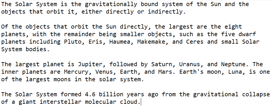 In the Understanding Latent Dirichlet Allocation post, we went through summarizing a chunk of text by organizing words through an importance score. In this post, we are going to take a step further by organizing concepts in a section of text by way of a relationship map, much like the one below on the solar system from the text below: